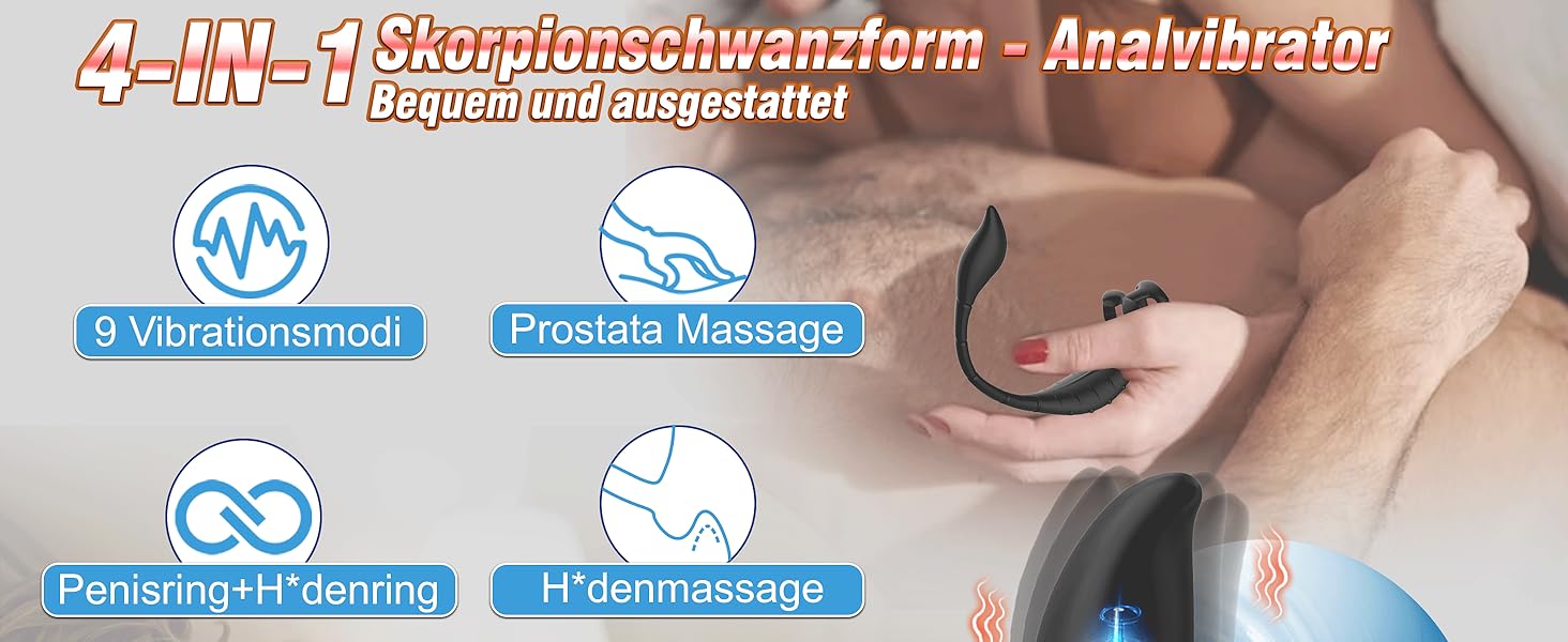 Front and back orgasm — 4 in 1, care for all your sensitive parts. Double penis rings support your erection and prolong the erection time. The perineum vibration wrapped around your lower body also brings an excellent sexual experience. The scorpion tail plug is gently inserted and not easy to slip out, perfectly touching your prostate.